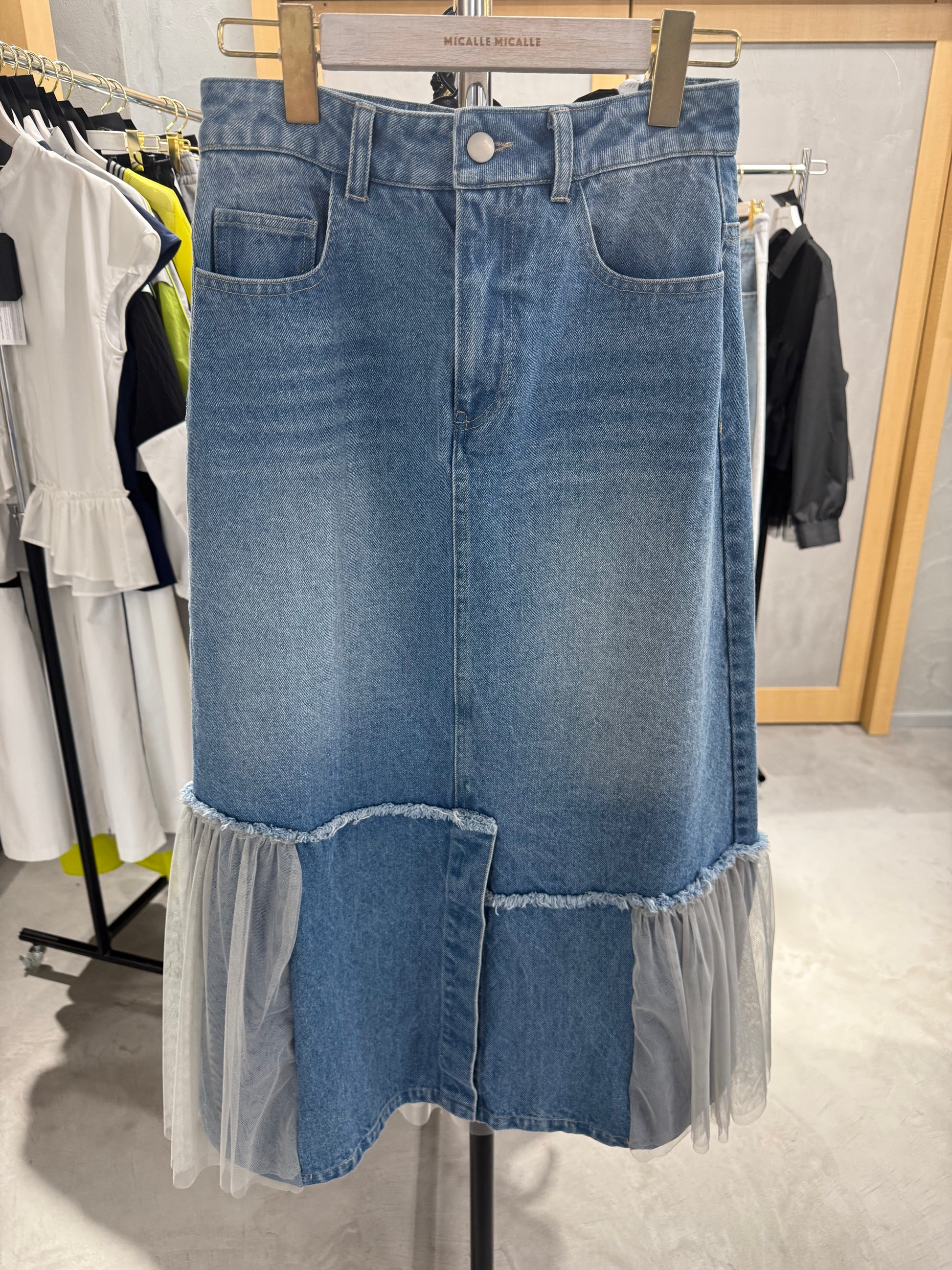 チュールドッキング デニムロングスカート[MICALLE MICALLE]